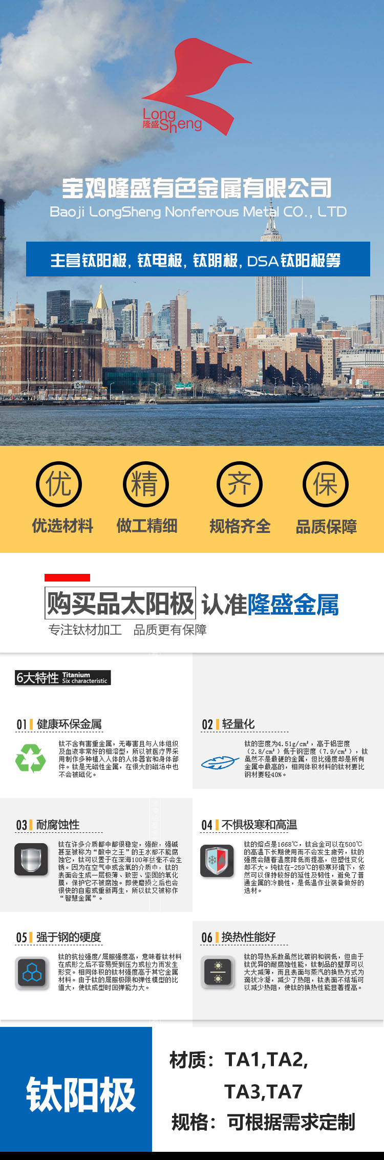 方法特點:電解法處理水的新技術因具有無需添加化學藥劑、設備體積小、占地不大、不產(chǎn)生二次污染等優(yōu)點而備受關注,采用電化學法處理廢水,電極材料是決定降解效率的關鍵,性能良好的陽極應該具有較高的有機物催化降解活性、良好的電極穩(wěn)定性和抗實際廢水腐蝕性能,同時成本盡可能低廉,有高析氧過電位的電極,鈦陽極是目前被普遍認為最有環(huán)境治理應用前景的電極之一。